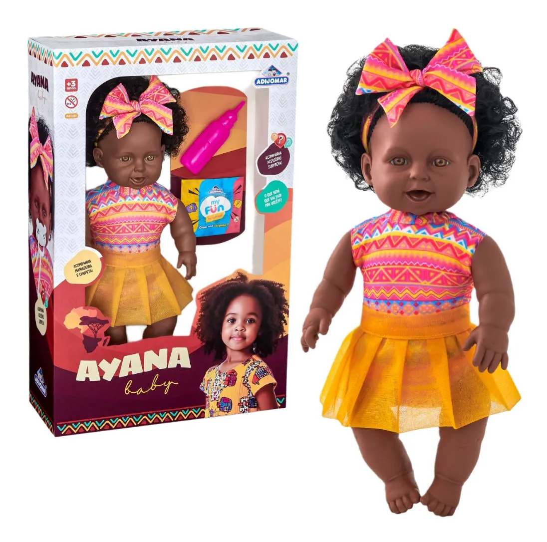 oneca Bebê Ayana Negra – 37cm | Corpo de Pano + Acessórios | Adijomar Brinquedos Apresentamos a encantadora Bebê Ayana Negra, uma boneca cheia de charme, feita com carinho para proporcionar momentos especiais de afeto, cuidado e brincadeiras criativas! Detalhes do Produto: Altura aproximada: 37 cm Corpo em tecido macio com enchimento Membros (braços, pernas e cabeça) em vinil 100% atóxico Toque suave e seguro para as crianças Ideal para brincadeiras de faz de conta, que estimulam a imaginação e o cuidado Acompanha acessórios: 1 chupeta 1 mamadeira 1 saquinho surpresa com peças extras para criar um novo look para a bebê!