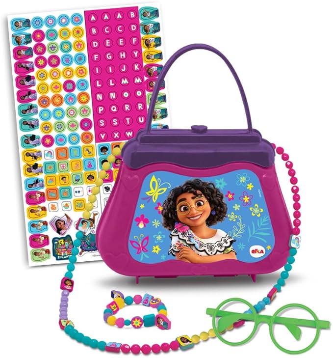 Mais de 140 peças para criar bijus personalizadas! Customize a bolsinha montando a alça e colando os adesivos.