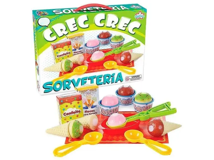 Com o Crec Crec Sorveteria da Bigstar, a criançada vai de divertir de maneira interativa e lúdica, explorando a imaginação e criatividade numa brincadeira de montar e servir sorvetinhos aos amiguinhos (as). É um dos itens de excelente vendagem da empresa, composto por: 1 travessa, 1 pá de sorvete, 2 caixinhas cartonadas, 2 toalhinhas cartonadas, 2 colheres, 3 copinhos, 3 casquinhas e 6 bolas de sorvete em cores variadas. Produto produzido em materiais adequados às crianças e aprovado/certificado pelo INMETRO. Indicado para crianças acima de 03 anos.