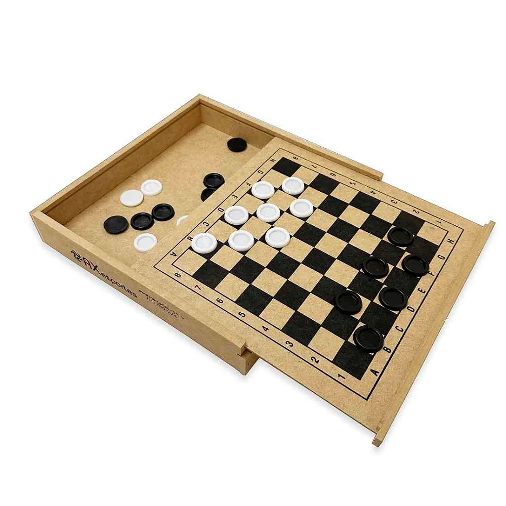 O Jogo de Dama e Trilha em madeira é uma opção clássica e divertida para todas as idades, oferecendo duas experiências de jogo em um único tabuleiro. O tabuleiro geralmente é feito de madeira resistente, com um acabamento envernizado, e pode incluir um compartimento para guardar as peças.