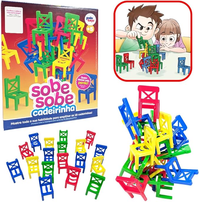 Seu objetivo é empilhar as cadeirinhas sem deixar a torre desabar, um desafio que estimula o raciocínio lógico e a percepção espacial. Além disso, pode ser jogado individualmente ou até 4 jogadores, incentivando a socialização e o trabalho em equipe.
