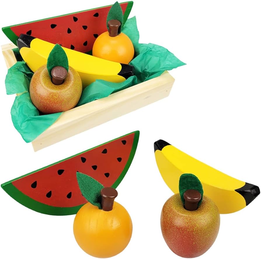 O Kit 4 Frutinhas sem Corte é sempre um sucesso na brincadeira! 1 Laranja 1 Banana 1 Maçã 1 Fatia de Melancia. São 4 peças de madeira, com acabamento perfeito e impressão de qualidade.