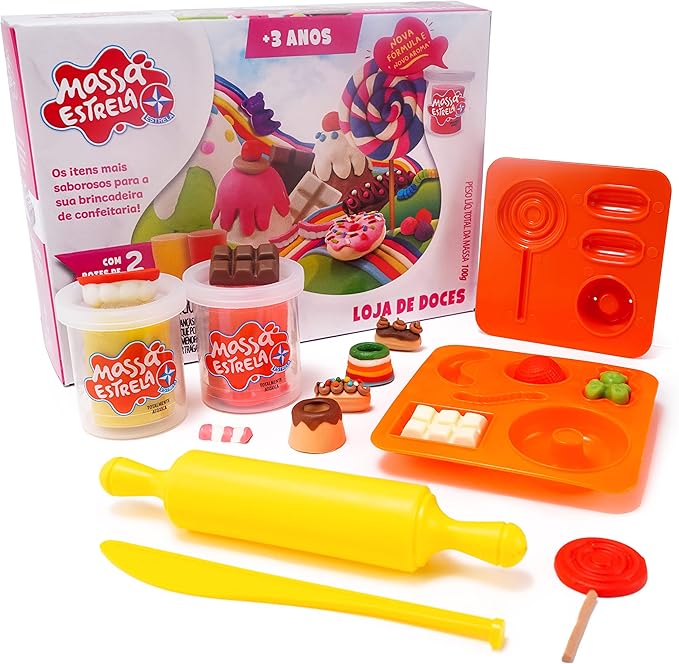 A Loja de Doces com Massa Estrela conta com dois potes de massa de 50g e duas formas com moldes de pirulito, balas, chocolate, gelatinas, donuts, churros e bolinho.