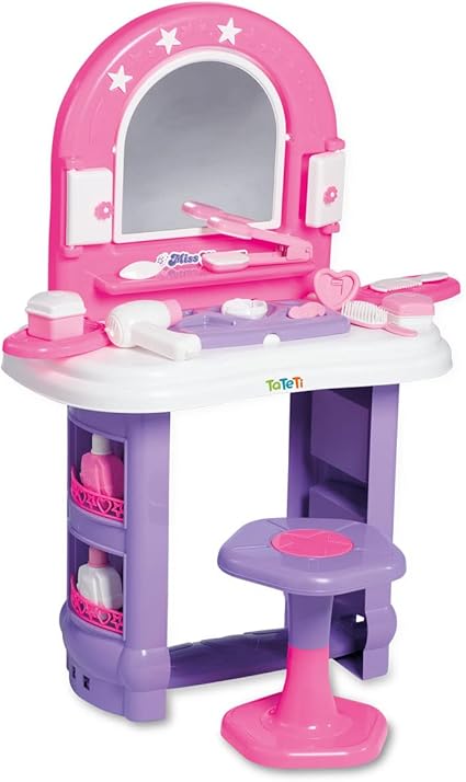 Isso mesmo, com espelho, banquinho e diversos acessórios para brincar com a turma. Além do espelho que é retrátil (3 posições), a penteadeira vem com porta jóias, mini porta retrato e frascos de perfume para que a produção seja completa.