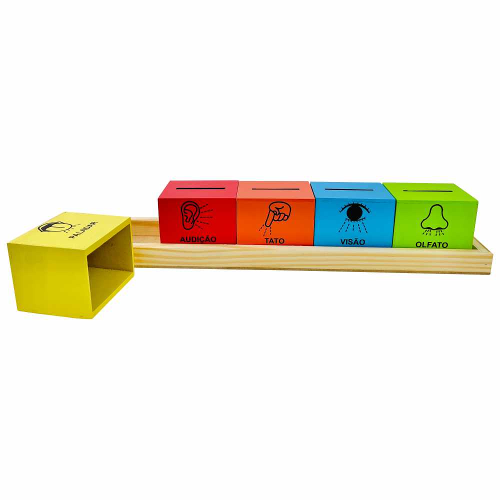 01 JOGO MEDINDO 440X190X178MM COM 05 CAIXAS REPRESENTANDO OS SENTIDOS, MEDINDO 81X72X55MM E 45 FICHAS DE CADA SENTIDO.