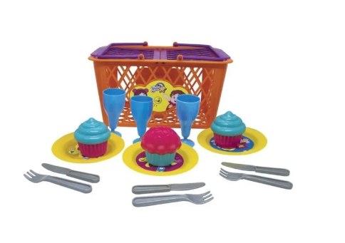 Brinque de pic nic com a maria clara e jp, a dupla mais amada do youtube. São 16 peças para brincar. 1 cesta, 3 pratos, 3 garfos, 3faca, 3 taça. 3 cupcakes de brinquedo.1 folha de adesivos